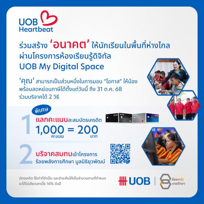• แลกคะแนนบัตรเครดิตยูโอบี: โดยทุก 1,000 คะแนน เท่าการบริจาค 200 บาท (ปกติ 100 บาท) ตั้งแต่วันนี้ถึง 31 ตุลาคม 2568