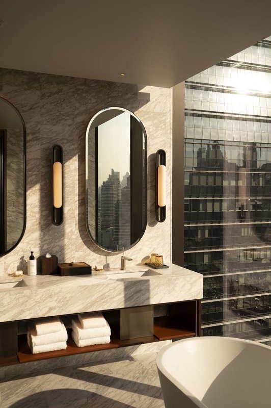 ห้องน้ำตกแต่งด้วยหินอ่อน ทุกห้องมีฝักบัวเรนชาวเวอร์ และผลิตภัณฑ์อาบน้ำ BYREDO กลิ่น Eleventh Hour พร้อมสิ่งอำนวยความสะดวกครบครัน ได้แก่ มินิบาร์ โดยหนึ่งในสิทธิประโยชน์คือเครื่องดื่มประเภทไร้แอลกอฮอล์พร้อมของว่างท้องถิ่นเพลิดเพลินได้แบบไม่มีค่าใช้จ่าย สมาร์ททีวีขนาด 65 นิ้ว Wi-Fi ความเร็วสูง เครื่องชงกาแฟ Nespresso และเครื่องเป่าผม Dyson ที่ช่วยยกระดับความสะดวกสบายในการเข้าพัก