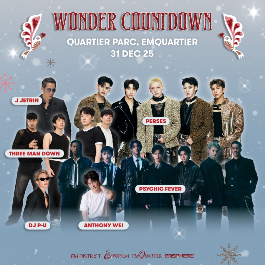 นอกจากนั้น ยังยกทัพศิลปินชื่อดังแถวหน้าของเมืองไทยร่วมสร้างสีสันและความสนุกแบบ นัน-สต็อป ร่วมเคาท์ดาวน์นับถอยหลังสู่ปีใหม่ 2026 ในบรรยากาศสุดอลังการ กับการแสดงคอนเสิร์ต แสง สี เสียง สุดตระการตาที่จะร่วมมอบความประทับใจให้ทุกคนส่งท้ายปี สร้างแลนด์มาร์กแห่งความสุขใจกลางถนนสุขุมวิท ด้วยกิจกรรม WONDER COUNTDOWN สนุก สุดมันส์กับการแสดงจากศิลปินชั้นนำของเมืองไทยและต่างประเทศ ได้แก่ เจ เจตริน, บุรินทร์, TREE MAN DOWN, PERSESศิลปิน J-POP PSYCHIC FEVER,ANTHONY WEI และดีเจชั้นนำ, DJ P-U ที่ QUARTIER PARC ศูนย์การค้าเอ็มควอเทียร์ ในค่ำคืนเคาน์ดาวน์ส่งท้ายปีเก่า 31 ธันวาคม 2568 ก่อนร่วมกันนับถอยหลังพร้อมกันสู่ปี 2026 อย่างยิ่งใหญ่