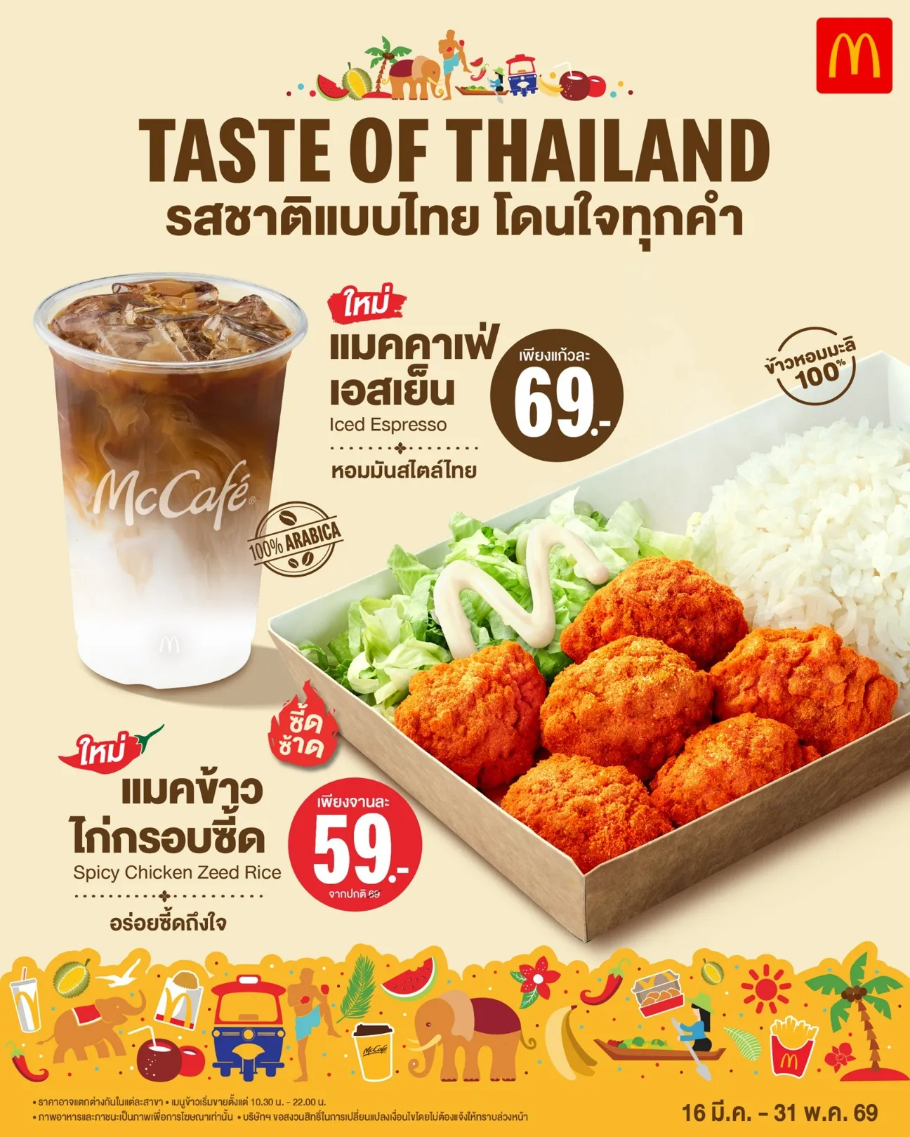 แมคโดนัลด์ จับเทรนด์ฮิต ชูความเป็นไทย สร้าง Brand Connection ผ่านการนำแรงบันดาลใจจากเมนูยอดนิยมของคนไทยมาพัฒนาความอร่อยในแบบฉบับแมคโดนัลด์ พร้อมถ่ายทอดเอกลักษณ์ของอาหารไทยผ่าน แคมเปญ ‘Taste of Thailand’ รสชาติแบบไทย โดนใจทุกคำ เปิดตัว 2 เมนู ใหม่ล่าสุด! ได้แก่ ‘แมคข้าวไก่กรอบซี้ด’ รสชาติจัดจ้าน อร่อยซี้ดถึงใจ กับไก่กรอบเนื้อแน่นที่คลุกเคล้ากับผงซี้ดรสจัดจ้านถึงเครื่องแบบไทยๆ อร่อยลงตัวกับผักกาดแก้วสดกรอบ เสิร์ฟพร้อมข้าวหอมมะลิไทยแท้ 100% เพียงจานละ 59 บาท และ ‘แมคคาเฟ่ เอสเย็น’ กาแฟหอมมันสไตล์ไทย จากกาแฟพรีเมี่ยมอาราบิก้า 100% ผสมความนัวของนม ใครเป็นสายกาแฟหวานมันแบบไทยๆ ต้องลอง ได้ดื่มรีเฟรชตัวเองง่ายๆ ทุกวัน ราคาเริ่มต้นแก้วละ 69 บาท หรือจะเลือกอร่อยคู่กัน ยิ่งเพิ่มความโดนใจทุกคำ!