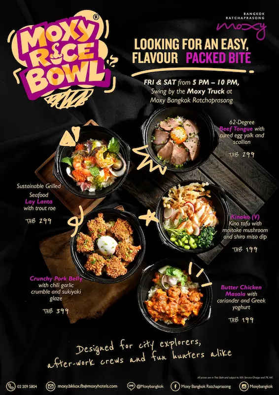 ในด้านอาหาร โรงแรมฯ ยังเปิดตัวคอนเซ็ปต์ใหม่ที่เน้นความยืดหยุ่นและการแบ่งปันช่วงเวลาดี ๆ ร่วมกันกับโปรโมชัน Moxy Rice Bowl ที่บริเวณเลาจน์และรถทรัค พร้อมเสิร์ฟเมนูข้าวสไตล์คอมฟอร์ตฟู้ดทุกวันศุกร์และเสาร์ เริ่มต้นที่ 199++ บาท นอกจากนี้ยังมี เมนูกับแกล้ม บริเวณเอาต์ดอร์เทอร์เรซ เปิดให้บริการทุกวัน เวลา 18.00–23.00 น. พร้อมของว่างสำหรับแชร์ เริ่มต้นที่ 99++ บาท ทั้งสองคอนเซ็ปต์สะท้อนสไตล์การรับประทานอาหารแบบเข้าถึงง่ายของม็อกซี่ ซึ่งออกแบบมาให้เหมาะกับทั้งคนเมืองและกลุ่มแฮงเอาต์หลังเลิกงาน