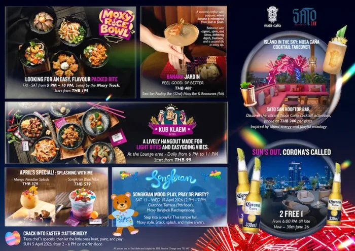 กรุงเทพฯ ประเทศไทย: 2 เมษายน 2569: ม็อกซี่ แบงคอก ราชประสงค์ โรงแรมม็อกซี่แห่งแรกของประเทศไทยและใหญ่ที่สุดในภูมิภาคเอเชียแปซิฟิก ชวนสัมผัสหลากหลายประสบการณ์ตลอดเดือนเมษายนนี้ ที่ผสานบรรยากาศตามฤดูกาล สีสันทางวัฒนธรรม และไลฟ์สไตล์การรับประทานอาหารแบบเป็นกันเองไว้ใจกลางราชประสงค์