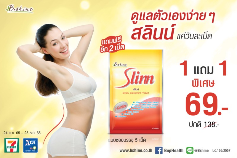 “สลินน์” ขนาดแบบซองบรรจุ 5 เม็ด (แถมฟรีอีก 2 เม็ดในซอง) จัดโปรโมชั่นพิเศษ ซื้อ 1 ซอง แถมฟรีอีก 1 ซอง เพียง 69 บาท จากปกติ 138 บาท ตั้งแต่วันนี้ – 25 ธันวาคม 2565 หาซื้อได้ที่ร้าน 7-Eleven ทุกสาขาใกล้บ้าน สามารถดูข้อมูลเพิ่มเติมได้ที่ www.bshine.co.th, FB : https://www.facebook.com/BnpHealth และ Line : @Bshine
