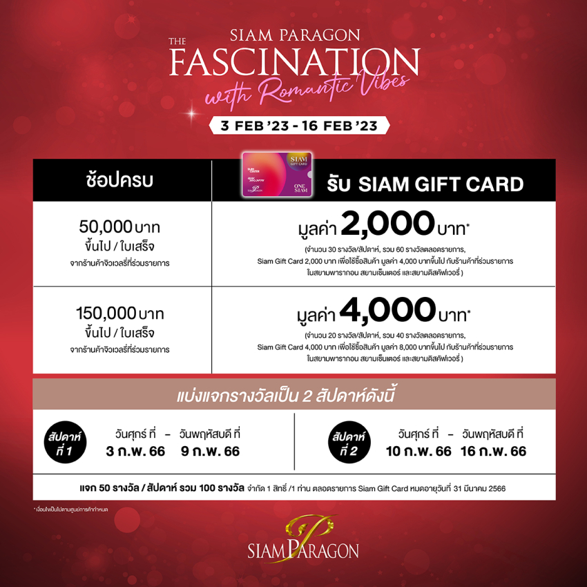 รับทันที Siam Gift Card ระหว่างวันที่ 3-9 ก.พ. 2566 และ 10-16 ก.พ. 2566 เมื่อซื้อสินค้าจากร้านเครื่องประดับที่ร่วมรายการครบ 50,000 บาทขึ้นไป/ใบเสร็จ รับ Siam Gift Card มูลค่า 2,000 บาท (30 รางวัล/สัปดาห์ รวม 60 รางวัลตลอดรายการ) และซื้อสินค้าจากร้านเครื่องประดับที่ร่วมรายการครบ 150,000 บาทขึ้นไป/ใบเสร็จ รับ Siam Gift Card มูลค่า 4,000 บาท (20 รางวัล/สัปดาห์ รวม 40 รางวัลตลอดรายการ)