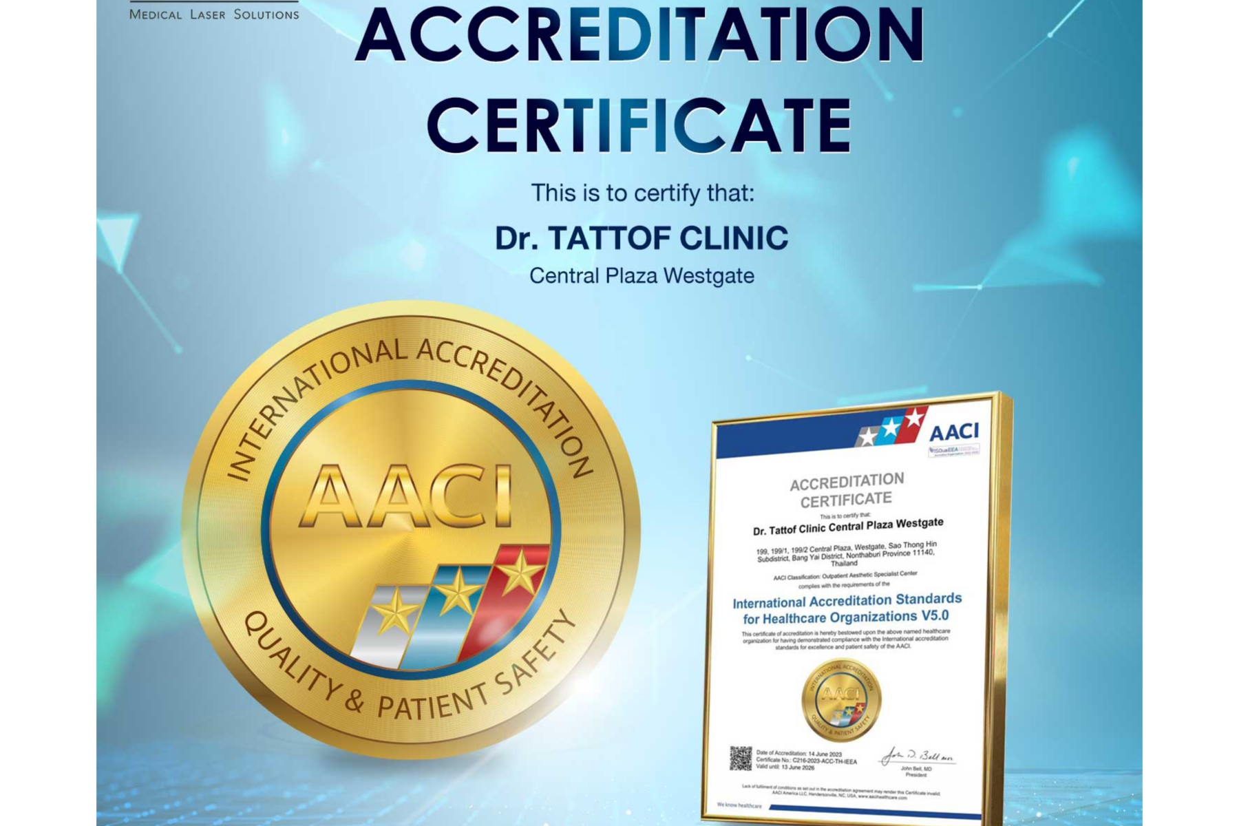 สำหรับภาพรวมการดำเนินงานของ Dr.TATTOF Clinic ในช่วงปีที่ผ่านมา ประสบความสำเร็จอย่างยิ่งในด้านการลบรอยสักด้วยโปรแกรม PicoWay Laser กับรางวัล “Best Achieve Tattoo Removal Treatment Award” การันตรีอันดับ 1 ในเอเชีย ด้านการลบรอยสัก แต่อย่างไรก็ตาม ทาง Dr.TATTOF ยังคงมุ่งมั่นตั้งใจยกระดับคุณภาพและความปลอดภัยของสถานพยาบาลให้แก่ผู้รับบริการที่เข้ารับการรักษาด้วยมาตรฐาน American Accreditation Commission International (AACI) เป็นการรับรองมาตรฐานของสถานพยาบาลสากลชั้นนำจากประเทศสหรัฐอเมริกา ที่เป็นที่ยอมรับทั้งในยุโรป อเมริกา เอเชีย และตะวันออกกลาง ซึ่ง Dr.TATTOF สาขาเซ็นทรัลพลาซ่าเวสต์เกต สามารถผ่านเกณฑ์การรับรองคุณภาพตามมาตรฐานสากล AACI เป็นสาขาแรก