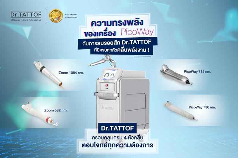 Program PicoWay Laser ที่ Dr.TATTOF มีทุกหัวความยาวคลื่น ตอบโจทย์ทุกการลบรอยสัก ได้ทุกแบบ ทุกขนาด ทุกสี และไม่ทำให้เกิดแผลเป็น อาทิ PicoWay Zoom 1064 นาโนเมตร หัวคลื่นดูดซับรอยสักสีดำ PicoWay Zoom 532 นาโนเมตร หัวคลื่นดูดซับรอยสักสีแดง สีเหลือง สีส้ม และ PicoWay 785/730 นาโนเมตร หัวคลื่นดูดซับรอยสักสีเขียว สีฟ้า