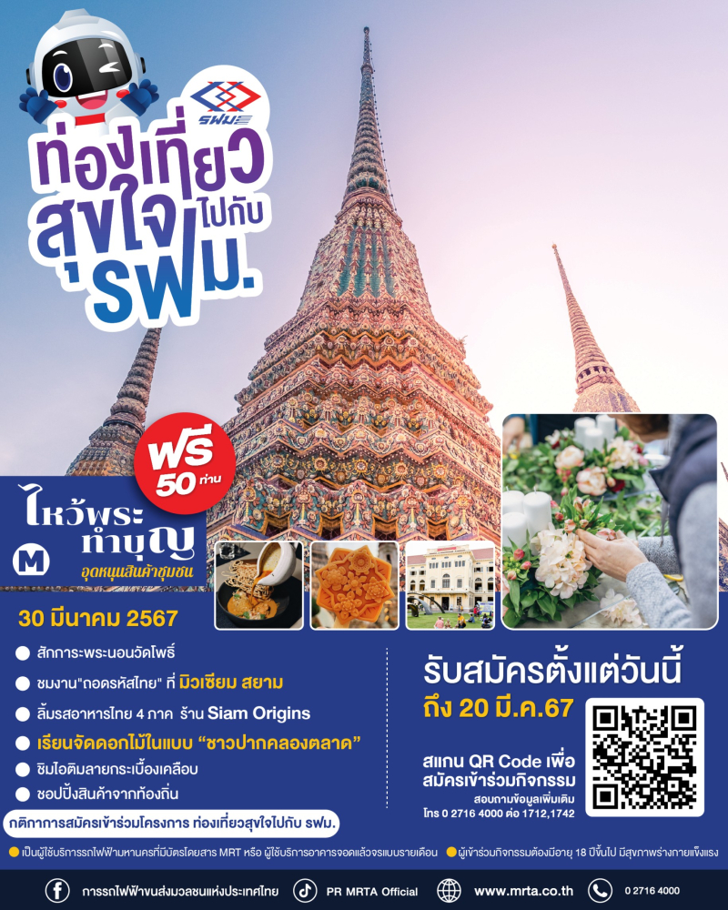 รฟม.ขอเชิญผู้ใช้บริการรถไฟฟ้า MRT และผู้ใช้บริการอาคารจอดแล้วจรของ รฟม. ร่วมกิจกรรม “ท่องเที่ยวสุขใจไปกับ รฟม.” ฟรี!! ภายใต้โครงการส่งเสริมแหล่งท่องเที่ยวของชุมชนตามแนวสายทางรถไฟฟ้า ประจำปี 2567 เดินชมวัดโพธิ์ สักการะพระนอน ชมพิพิธภัณฑ์มิวเซียมสยาม พิพิธภัณฑ์ใต้ดิน ณ MRT สนามไชย รับประทานอาหารกลางวันร้าน Siam Origins ร้านอาหารไทยพื้นบ้านสี่ภาค และร่วมกิจกรรม Workshop