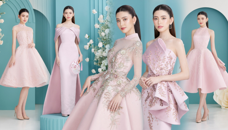 และอีก 5 ชุดยกน้ำชาสีชมพูกลีบบัวที่สวยละมุนนีเหมาะกับเจ้าสาวที่ชอบลุคที่ดูสดใสน่ารักไม่ซ้ำใคร ซึ่งแต่ละชุดนั้นถูกออกแบบมาให้สวยงดงามแต่งต่างเหนือใคร เริ่มที่ชุดเดรสสีชมพูกลีบบัวโอบไหล่สยายปีก ชุดแรกนี้กันเลย ตัวกระโปรงถูกออกแบบให้ยาวถึงพื้นทรงสอบดินสอเป็นสไตล์เวสเทิร์น ด้านหลังมีผ้าจับ ทำเป็นเดรฟเกาะตรงส่วนขอบของเกาะอกชิ้นหลัง ตัวชุดประดับตกแต่งด้วยมณีนพเก้ารวมถึงขนของหงส์ที่นำมาย้อมแบบไล่ระดับเฉดสี บรรจงปักที่ตัวผ้างดงามอ่อนหวาน สง่างามเหนือคำบรรยาย
